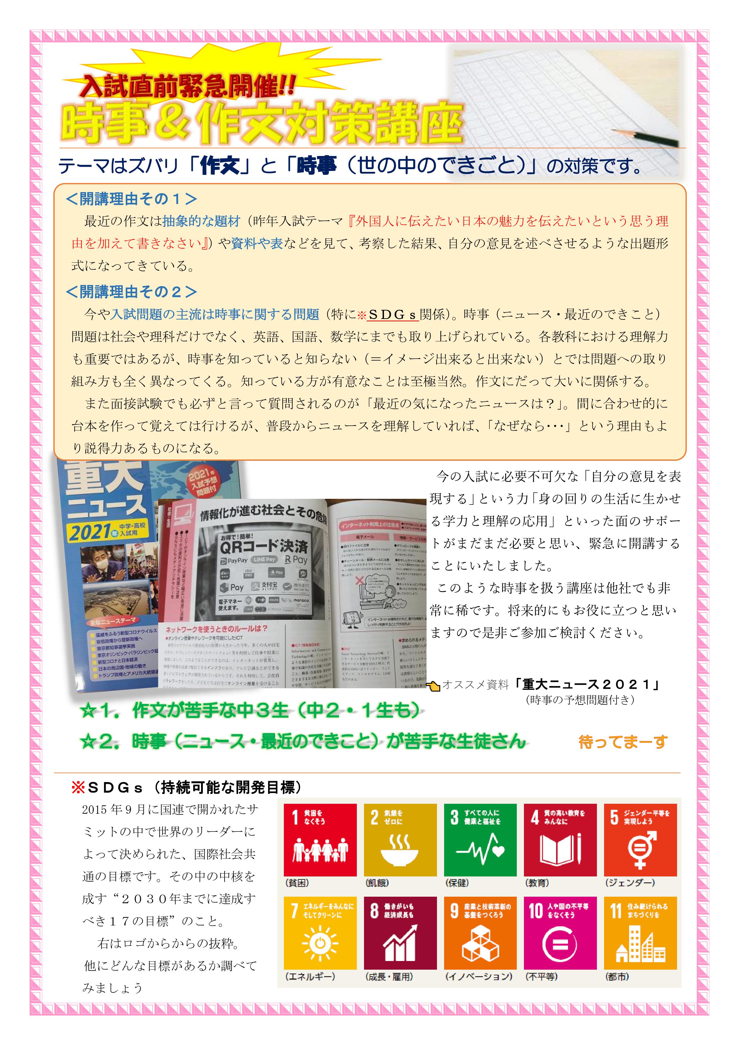 「時事問題」と「課題作文」をセットにした対策講座を急きょ開講することにしました。