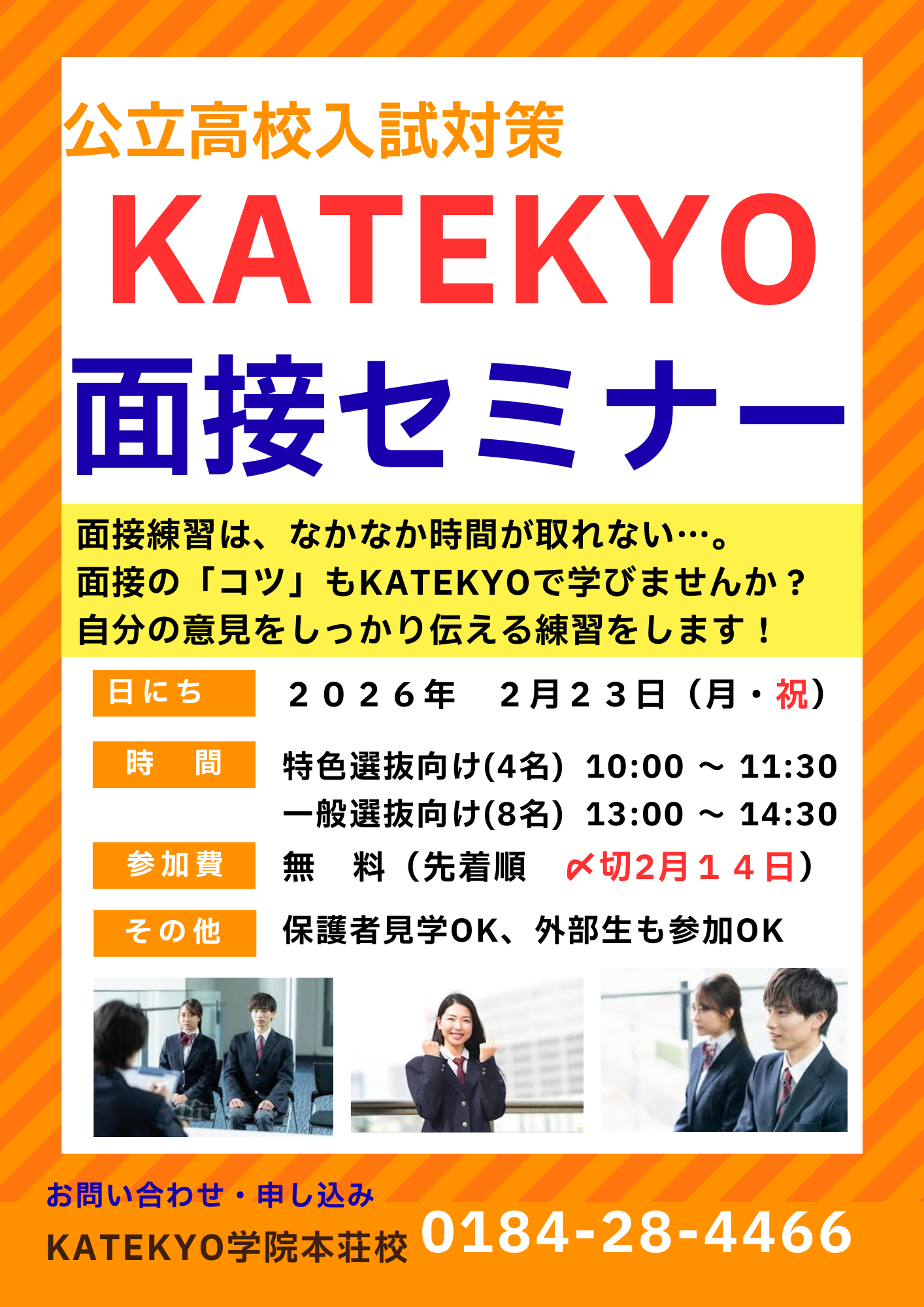 そこで、KATEKYO学院本荘校では「面接セミナー」を開催するにしました。面接に向かう姿勢、答弁の仕方など、KATEKYOならではの切り口で指導します。
