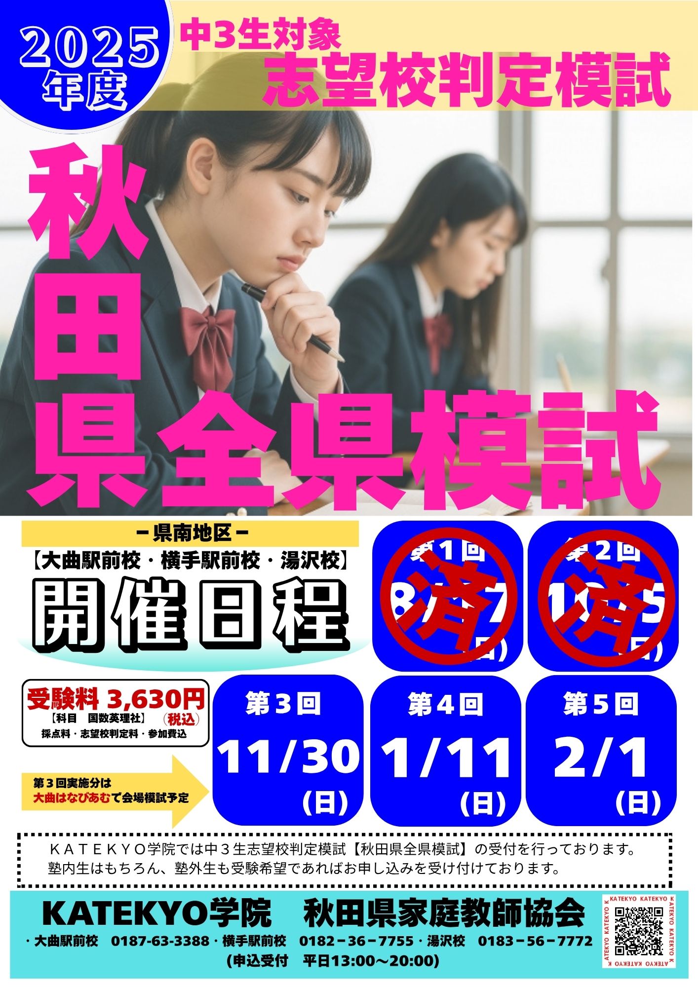 KATEKYO学院では中学3年生を対象に秋田県全県模試(志望校判定模試)の受付も行っております。