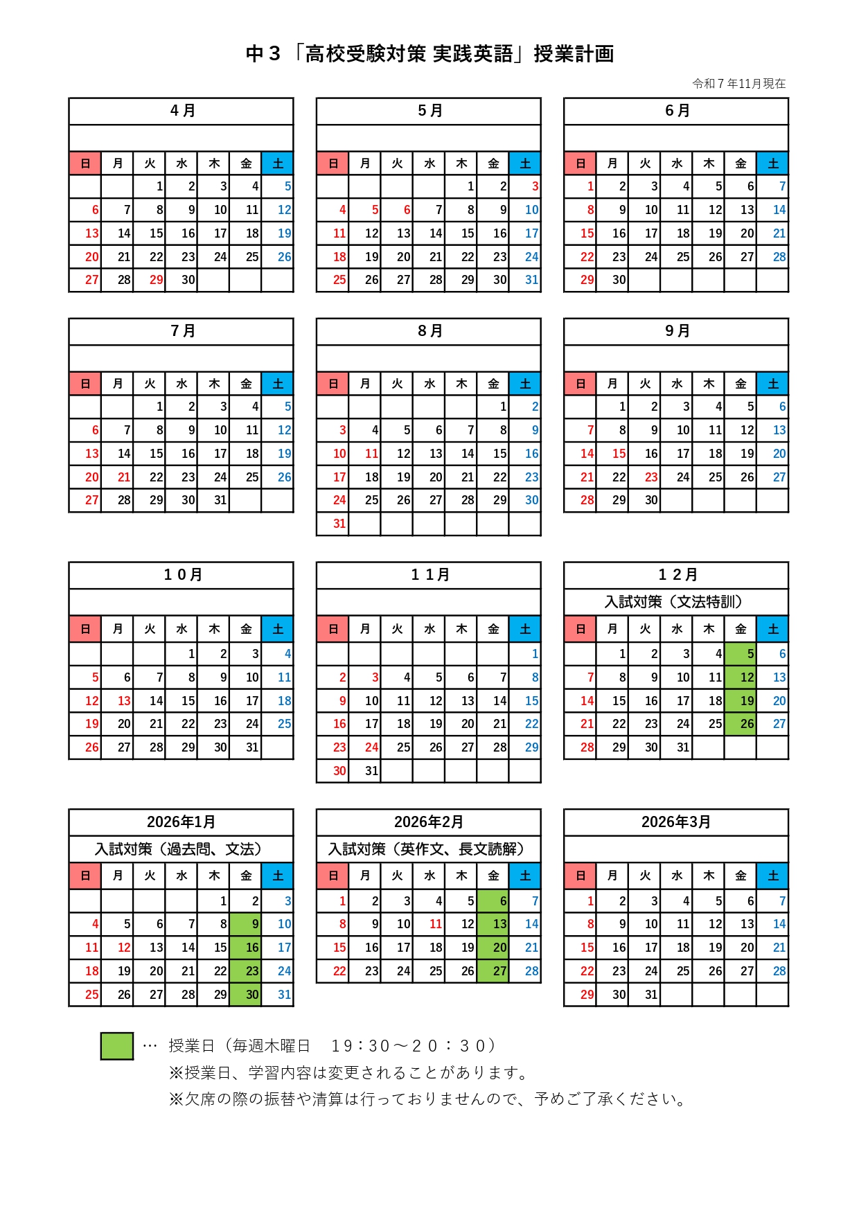 中学校3年生へのご案内です。曜日を変更して、新規開講いたします。