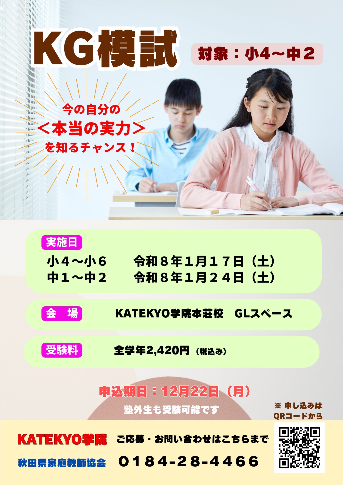 KATEKYO学院本荘校 では、今の自分の〈本当の実力〉を知るチャンス、KG模試を開催します。