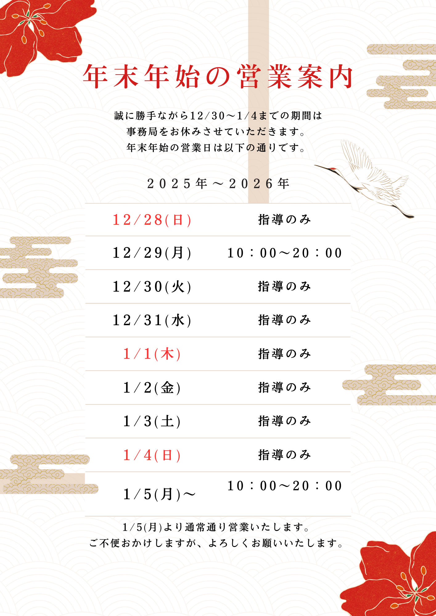 2025年12月30日(火)より2026年1月4日(日)まで年末年始休業とさせて頂きます。
