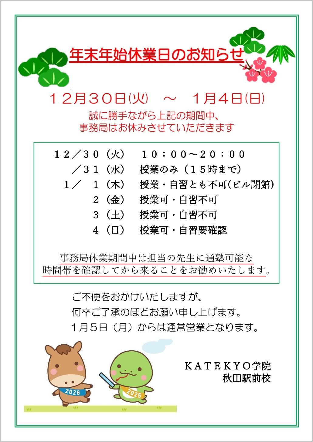 年末年始は以下の通り、事務局はお休みさせていただきます。事務局休業日でも担当の先生と予定を組んでいれば授業は可能です。自習可能日・時間等詳細は各教室にご確認ください。