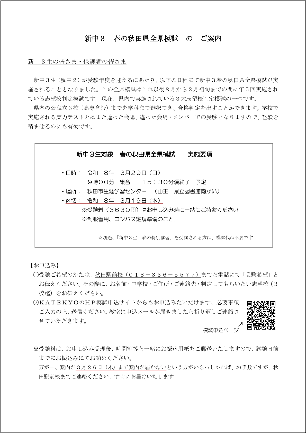 模試のお申し込みお問合せは018-836-5577(秋田駅前校)まで