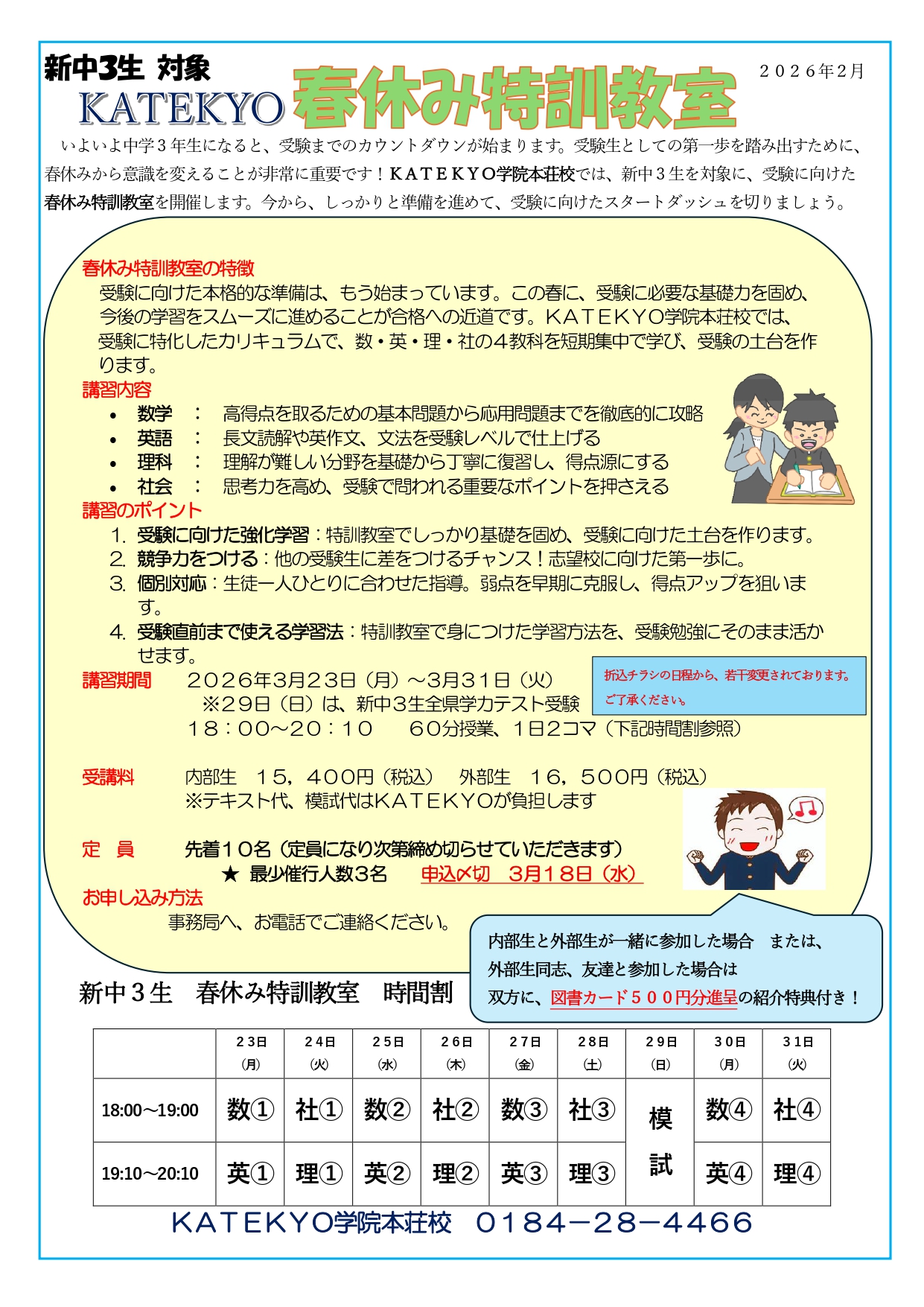 KATEKYO学院本荘校では、新中3生を対象に、受験に向けたスタートを切る春休み特訓教室を開催します。今から、しっかりと準備を進めて、受験に向けたスタートダッシュを切りましょう。