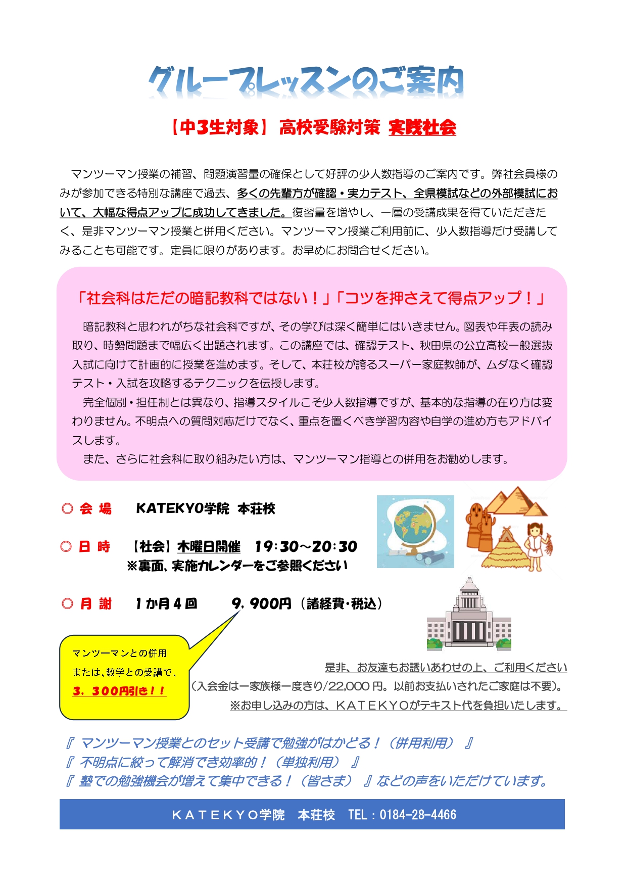 KATEKYO学院本荘校 では、高校入試まで計画的に社会科の学習を行う「高校受験対策 実践社会」を4月より開講いたします。この講座では、社会の基礎から受験を見据えた実践的な問題まで、少人数制でしっかり学べる環境を提供いたします。