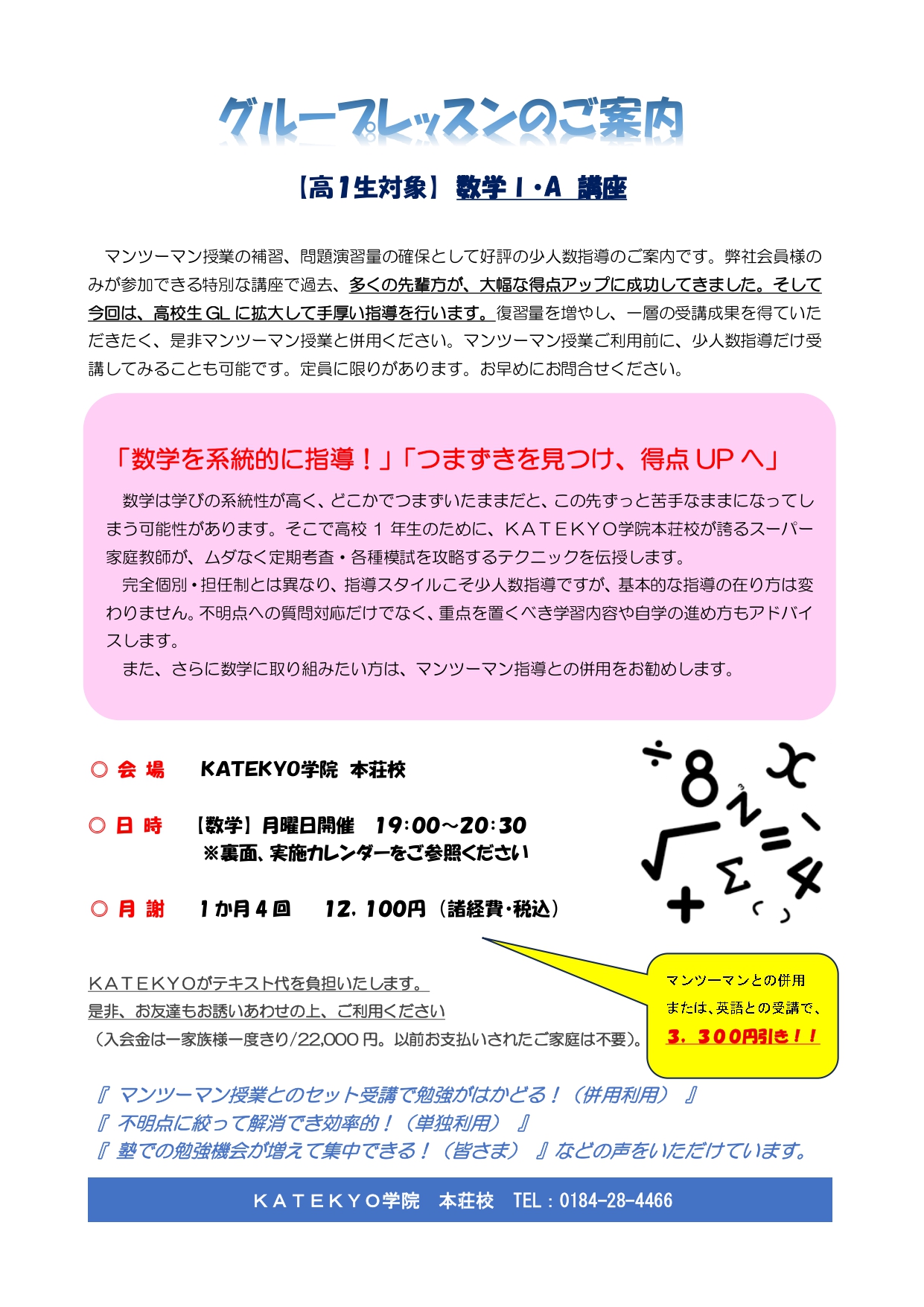 マンツーマンとの併用、または複数受講で、それぞれ3,300円割引します。