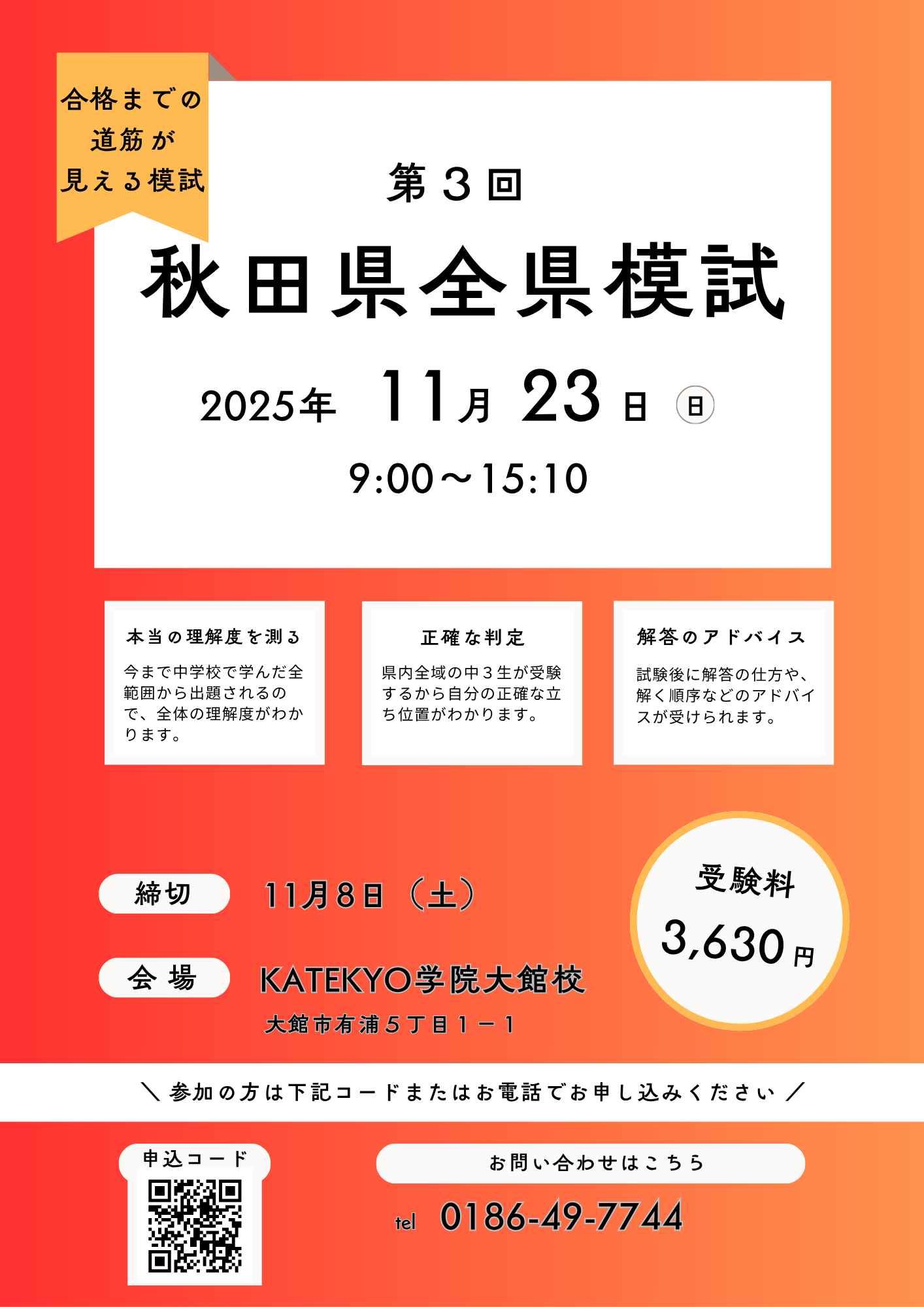 KATEKYO学院大館校では、11月23日(日)に秋田県高校入試研究協会による全県模試を実施いたします。高校入試本番に向けて、模試をたくさん受験してライバルに差をつけましょう!!!
