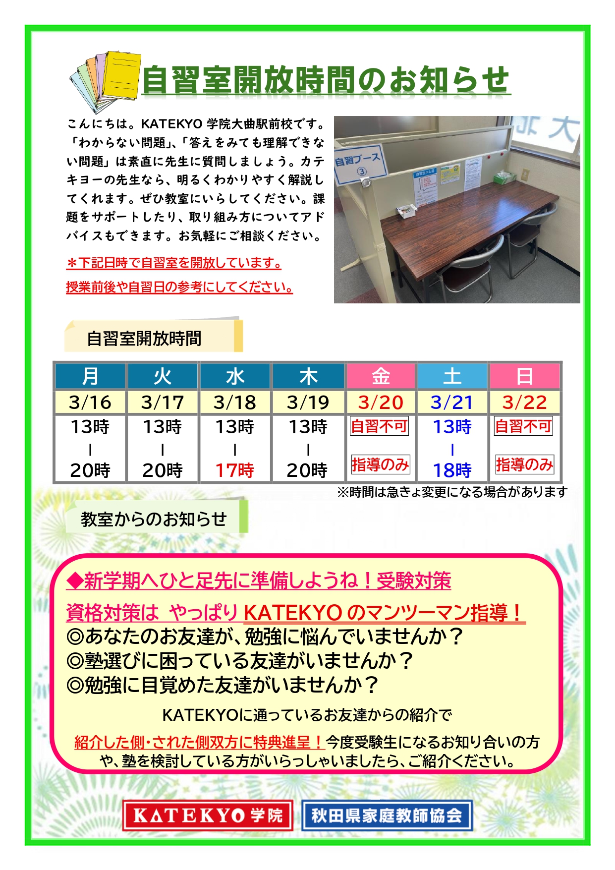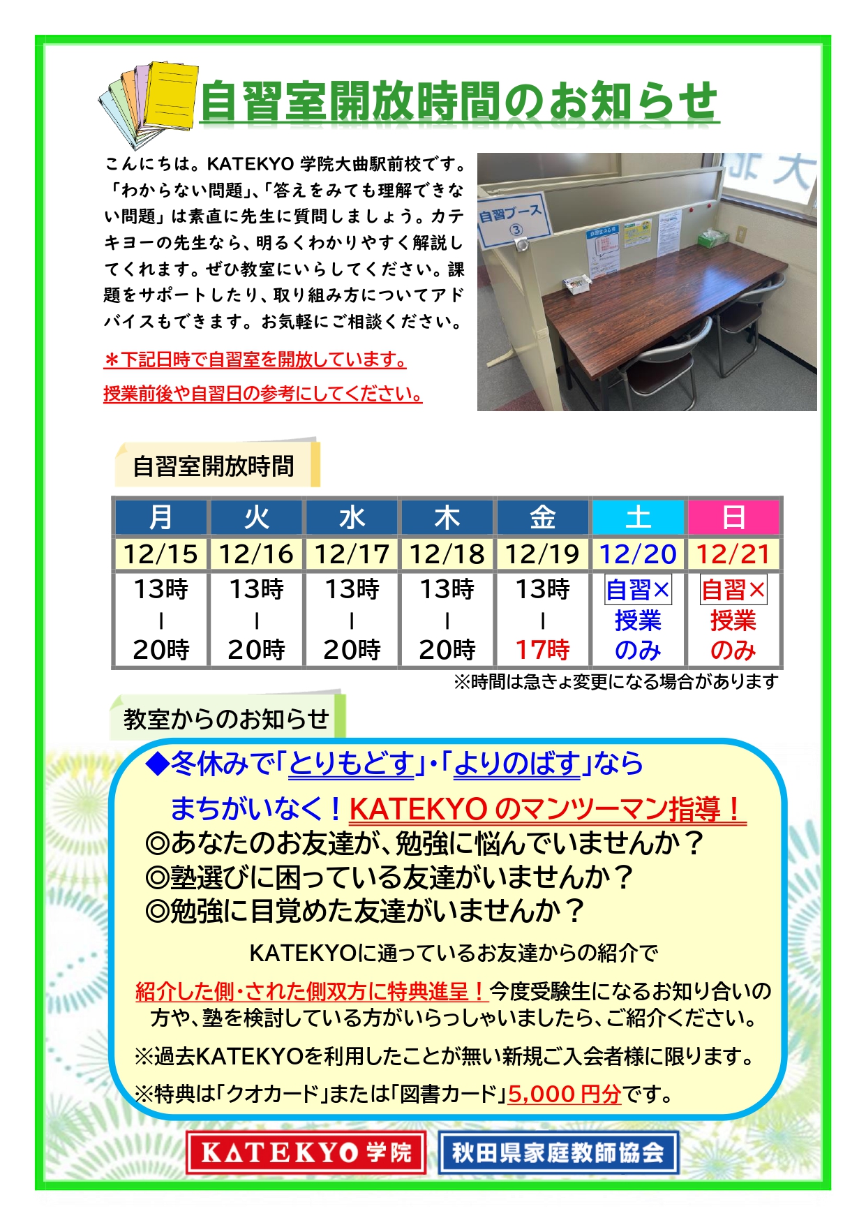 まずはお電話を!大曲駅前校直通:0187-63-3388