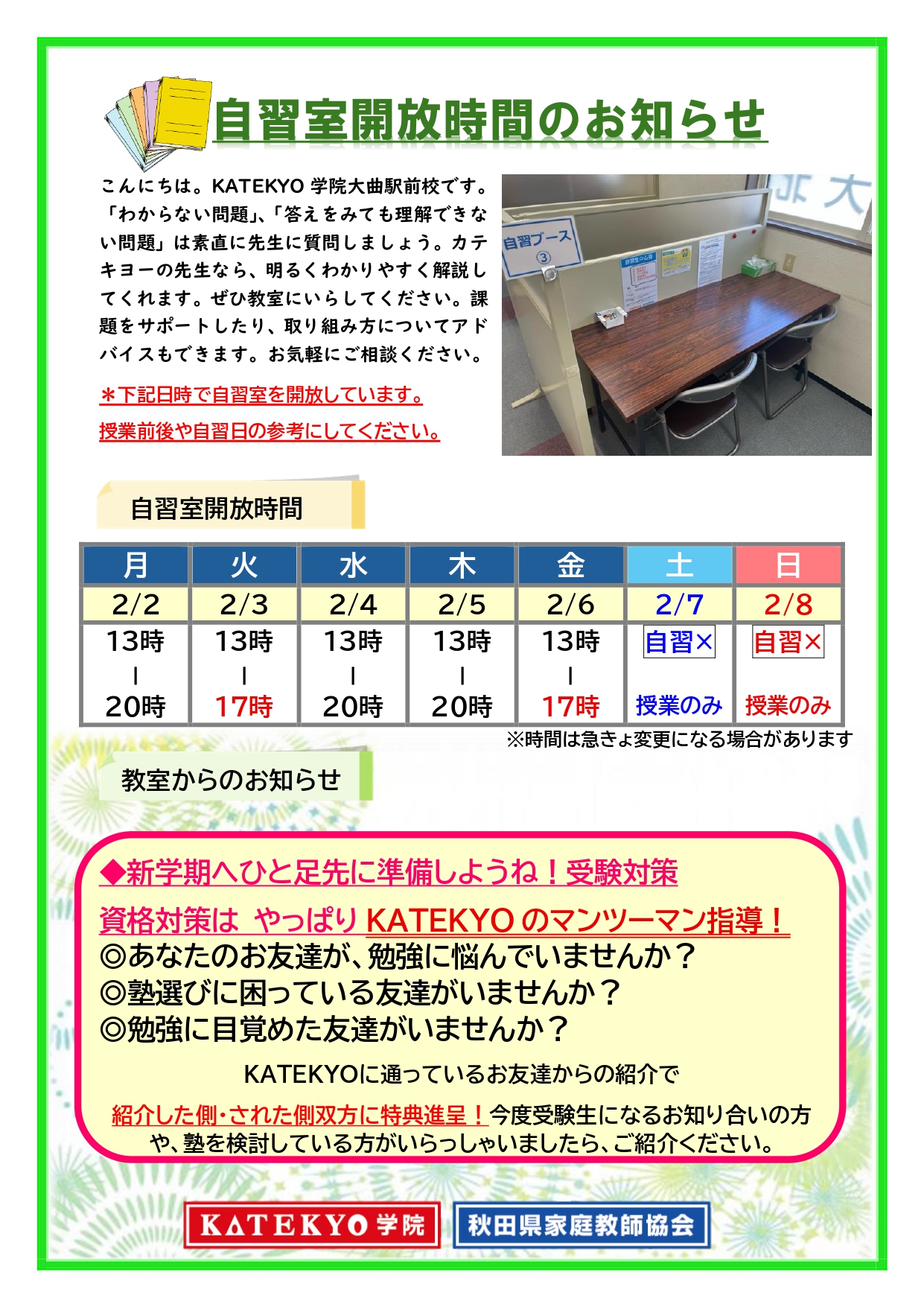 まずはお電話を!大曲駅前校直通:0187-63-3388
