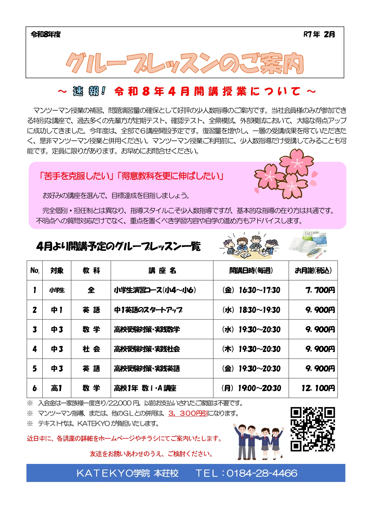 2026年4月より、KATEKYO学院本荘校 では、グループレッスン(GL)を6講座、開講いたします。小学生から高校生まで、少人数指導の講座がたくさんあります。ぜひ、「これだ!」と思う講座をお選びください。